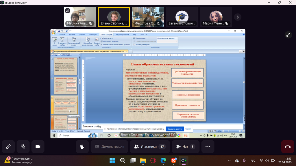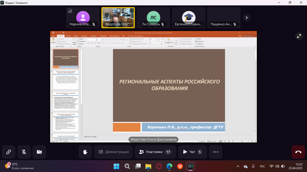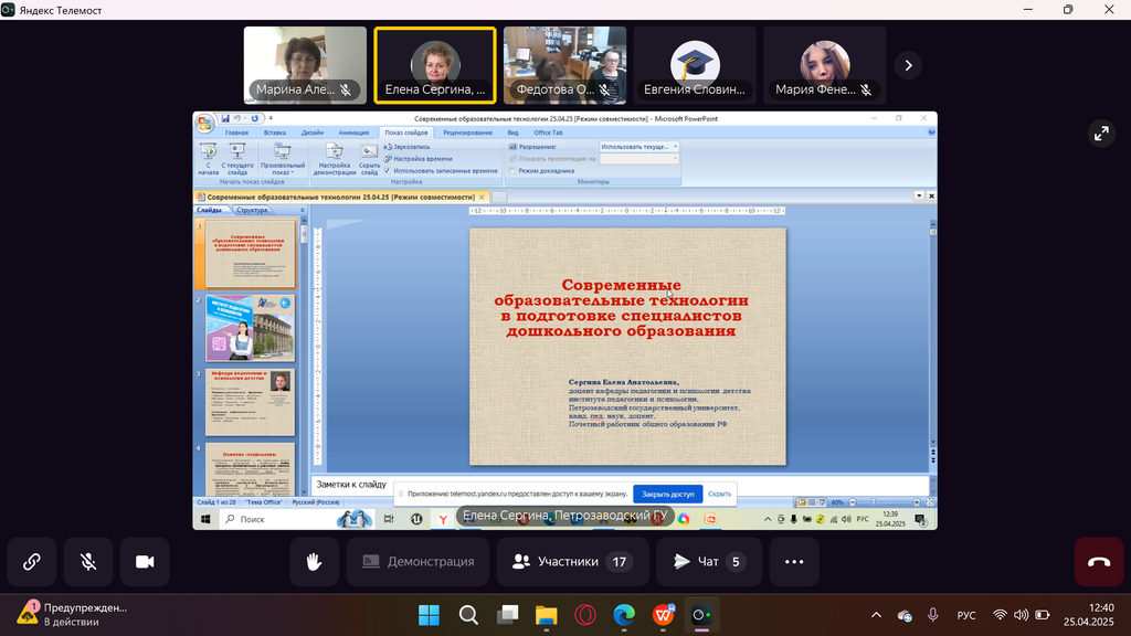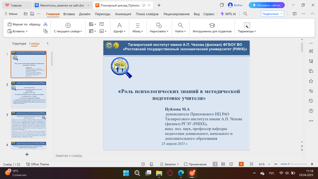 Новости все 30 апреля, 2025 Участие профессора кафедры педагогики дошкольного, начального и дополнительного образования Пуйловой М.А. в I Всероссийской научно-практической конференции «Дошкольное и начальное образование в новых регионах: особенности и перспективы развития»25 апреля кандидат педагогических наук, профессор кафедры педагогики дошкольного, начального и дополнительного образования, руководитель Приазовского научного центра РАО Таганрогского института имени А.П. Чехова Пуйлова Марина Алексеевна приняла участие в I Всероссийской научно-практической конференции «Дошкольное и начальное образование в новых регионах: особенности и перспективы развития» в Мелитопольском государственном университете. Цель конференции: популяризация знаний о современных тенденциях развития образования среди педагогов-практиков, молодых ученых, совершенствование навыков научной деятельности, которые пригодятся на практике молодым специалистам, расширение научного мировоззрения, понимание современных тенденций в образовании. Тематическими направления работы конференции были обозначены: – инновационные технологии и практическая деятельность современного воспитателя детских образовательных организаций; – профессиональная деятельность современного учителя начальных классов: реалии и перспективы. Марина Алексеевна выступила на пленарном заседании с докладом «Роль психологических знаний в методической подготовке учителя». |
