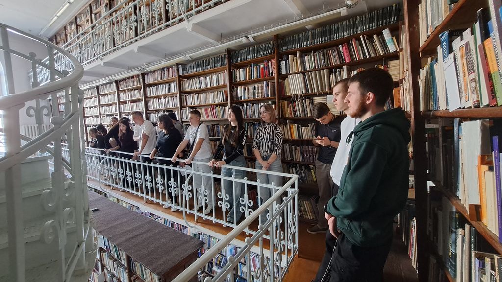 Интерактивная экскурсия в Библиотеке имени А.П. Чехова15 апреля 2025 г. студенты первого курса направления подготовки «Юриспруденция» гр. ЮР-611 совместно с куратором В.А. Тимофеенко приняли участие в интерактивной экскурсии по Библиотеке имени А.П. Чехова. Данная экскурсия объединяет в себе развлекательный и образовательный компоненты, в ней задействованы краеведческие ресурсы, интерактивные карты, плакаты, оцифрованные копии книг с эффектом перелистывания страниц и многое другое. Экскурсия начинается в вестибюле исторического здания библиотеки, затем переходит в концертно-выставочный зал и чеховскую гостиную. Посетители познакомились с небольшой экспозицией по истории библиотеки, далее переход в «Центр электронных ресурсов и библиографии», где обратили внимание студентов на окно в потолке, как интересное архитектурное решение, рассказали о собственных и удаленных электронных ресурсах: Национальной электронной библиотеке, Президентской библиотеке и др. Экскурсия продолжается в «Центре универсального обслуживания» с посещением уникального книгохранилища со старинной винтовой лестницей. В отделе дореволюционных и ценных изданий с помощью мультимедийных технологий студентов познакомили с оцифрованными изданиями библиотеки и дали возможность полистать страницы электронных книг, не доступных для чтения обычным пользователям в бумажном формате. Затем экскурсия переходит по галерее в новое здание библиотеки и продолжается в «Центре оцифровки документов». Впервые в ходе экскурсии ребятам был показан процесс оцифровки на планетарном книжном сканере и посещение «Центра правовой и экономической информации», «Центра естествознания и медицины», «Электронного зала», «Городской абонемент», отдела «Центр краеведческой информации». Кульминацией экскурсии стала музейная экспозиция «Свидетели истории Таганрога», которая позволяет участникам почувствовать связь поколений, не только зрительно, но и тактильно знакомясь с предметами экспозиции. В завершении, сотрудники библиотеки предложили студентам принять участие в викторине об истории, культуре и достопримечательностях Таганрога, подарили присутствующим блокноты и открытки с символикой города. |