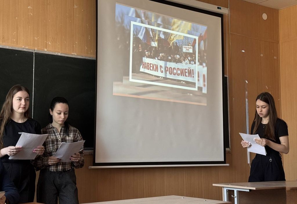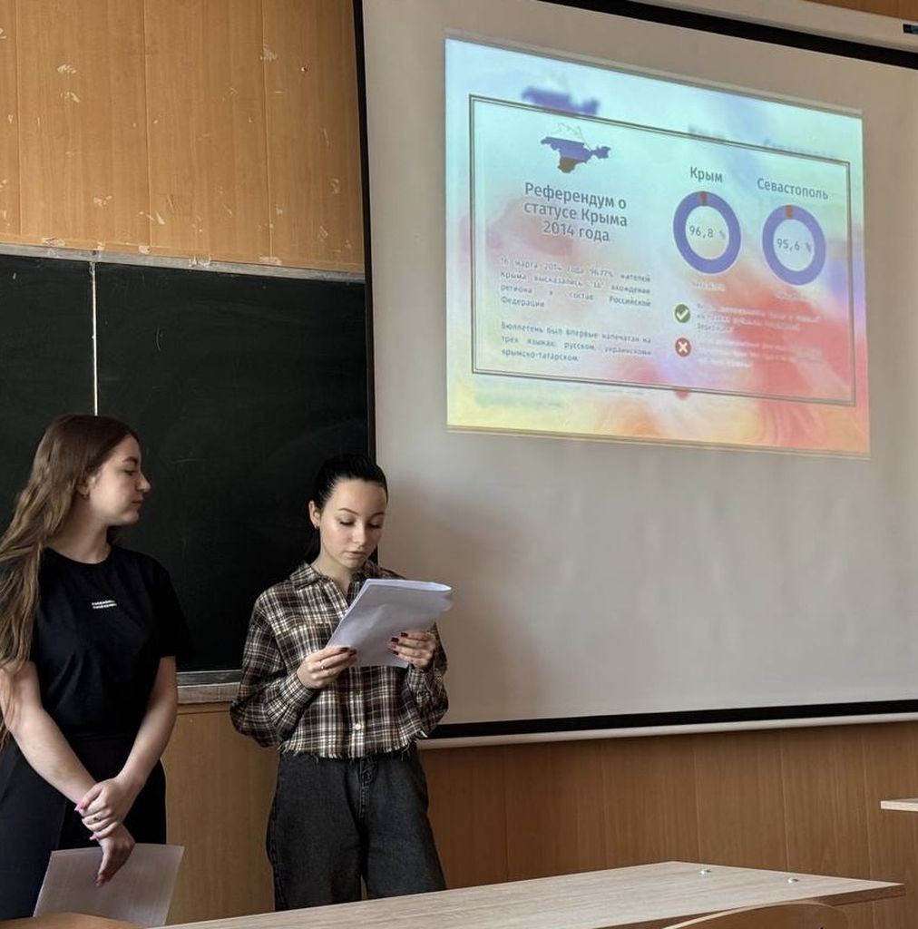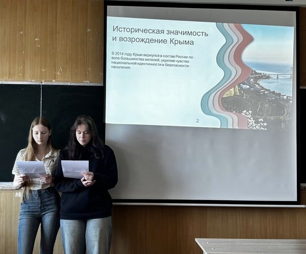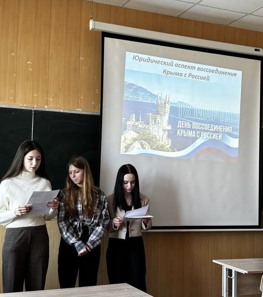 Заседание СНК «Теоретико-правовые и философские исследования государственно-политических институтов» на тему «Крымская весна. Россия и Крым: общая судьба»16 марта 2026 года на первом курсе направления подготовки «Юриспруденция» кандидат философских наук, доцент, куратор группы ЮР-611 В. А. Тимофеенко организовала заседание СНК «Теоретико-правовые и философские исследования государственно-политических институтов», посвященное Дню воссоединения Крыма и Севастополя с Российской Федерацией. Цель заседания – воспитание ценностного отношения к истории своей страны, понимание исторического значения воссоединения Крыма и Севастополя с Россией. В заседании приняла участие заведующая кафедрой экономики и гуманитарно-правовых дисциплин, кандидат юридических наук Ю. А. Сердюкова. Она отметила, что такое событие, как Крымская весна, имеет огромное значение для страны и навсегда останется в сердцах россиян как символ сплоченности и единства. В ходе обсуждения говорили о проведенном 16 марта 2014 года референдуме, на котором жители Крыма добровольно и свободно высказались за воссоединение с исторической Родиной – Россией, реализовав свое право на самоопределение. Участники отметили исторические и юридические аспекты воссоединения Крыма и России, обсудили социально-экономическое и геополитическое значение этого события. Подводя итоги, присутствующие сделали вывод о том, что 18 марта 2014 года – дата заключения международного договора между Автономной Республикой Крым и Российской Федерацией о вхождении в ее состав – является значимой датой для истории страны и для ее идентичности. |