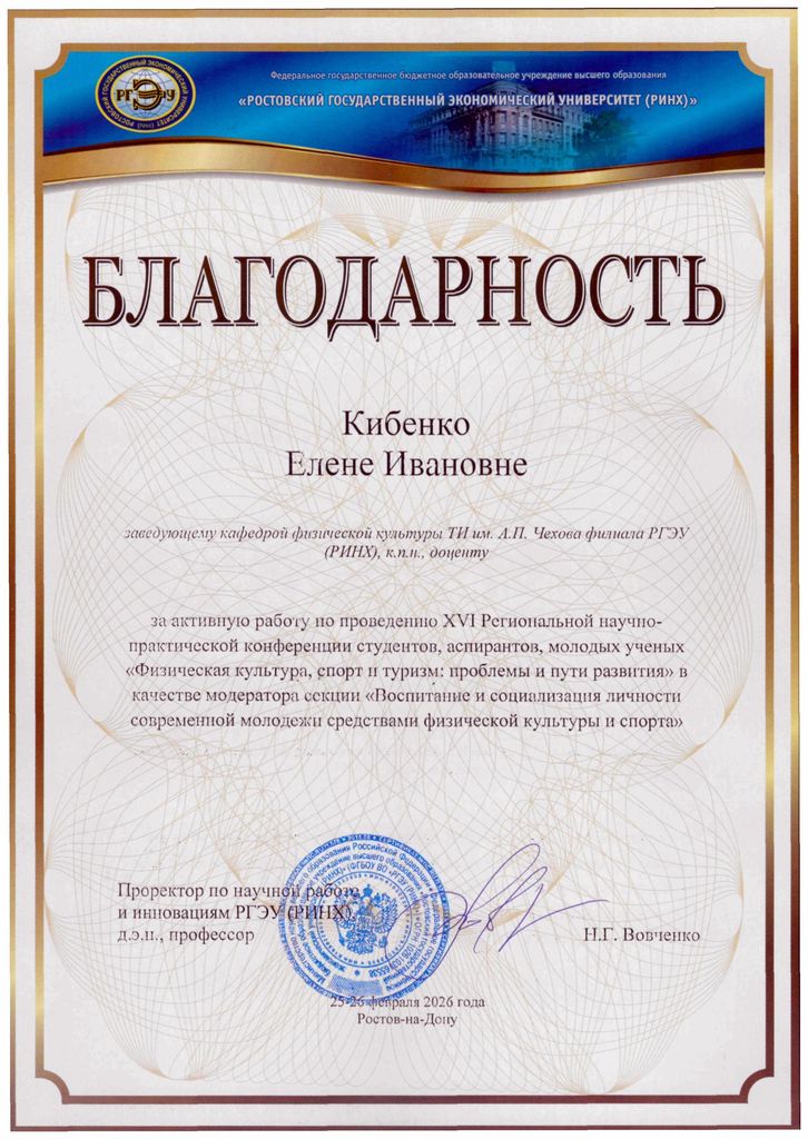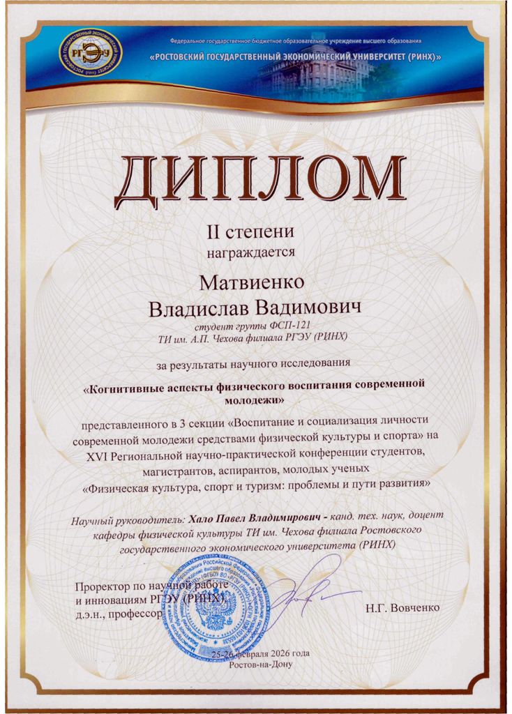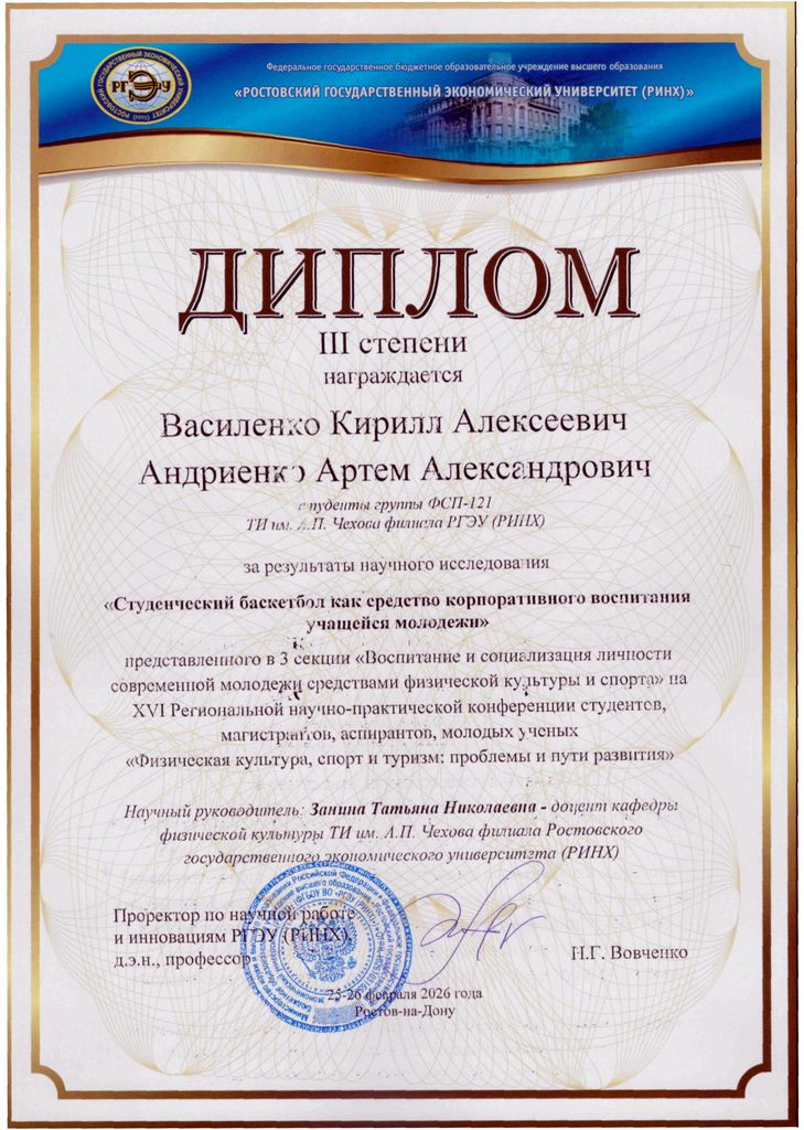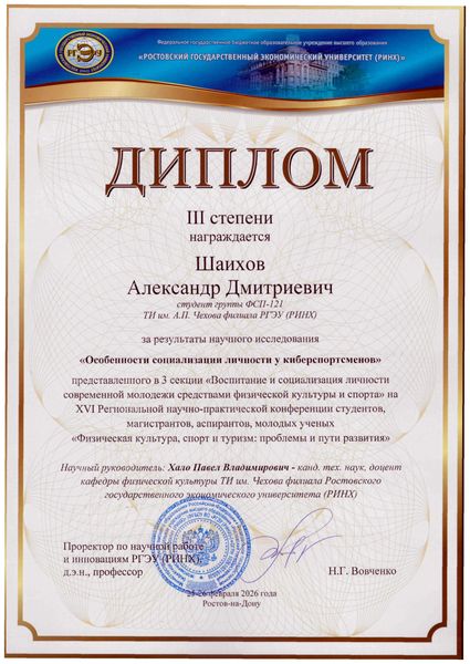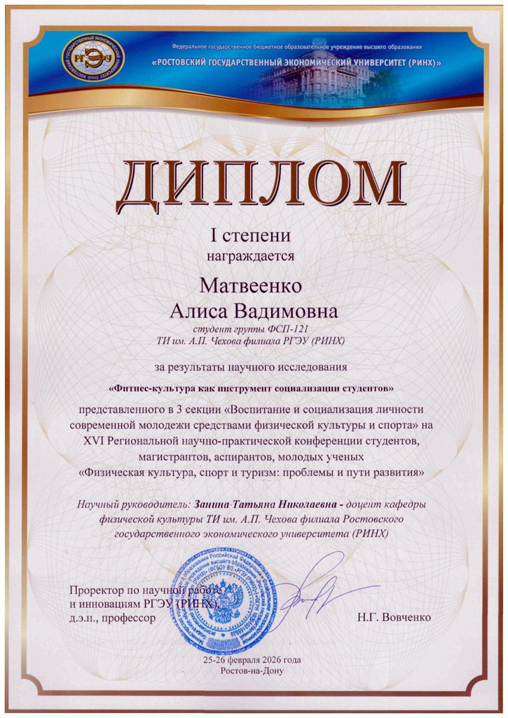 Новости все 03 апреля, 2026 Студенты ФФМИ профилей «Физическая культура» и «Дополнительное образование (спортивная подготовка)» достойно представили свои доклады на XVI региональной научно-практической конференции «Физическая культура, спорт и туризм: проблемы и пути развития»31 марта стали известны результаты XVI Региональной научно-практической конференции студентов, магистрантов, молодых ученых «Физическая культура, спорт и туризм: проблемы и пути развития». Конференция проходила в смешанном формате 25 и 26 февраля 2026 года в Ростовском государственном экономическом университете (РИНХ). В работе конференции приняли участие студенты, аспиранты, молодые ученые РГЭУ (РИНХ), ДГТУ, РЮИ МВД России, ДонГАУ, ЮРИУ филиал РАНХиГС, а также студенты Таганрогского института имени А.П. Чехова (филиала) РГЭУ (РИНХ) профилей «Физическая культура» и «Дополнительное образование (спортивная подготовка)». Доклады представляли: Колотева Виктория Сергеевна (ФФМИ, ФСП-131), тема доклада: «Влияние художественной гимнастики на различные аспекты жизни человека». Научный руководитель: доцент кафедры физической культуры Татьяна Николаевна Занина. Василенко Кирилл Алексеевич, Андриенко Артем Александрович (ФФМИ, ФСП-121), тема доклада: «Студенческий баскетбол как средство корпоративного воспитания учащейся молодежи». Научный руководитель: доцент кафедры физической культуры Татьяна Николаевна Занина. Сенченко Станислав Вячеславович (ФФМИ, ФСП-111), тема доклада: «Социально-психологические особенности подготовки, повышения результативности и сохранения когнитивного здоровья в киберспорте». Научный руководитель: кандидат технических наук, доцент кафедры физической культуры Павел Владимирович Хало. Лисицкая Екатерина Алексеевна (ФФМИ, ФСП-141), тема доклада: «Решение социальных и психологических проблем обучающихся с ограниченными возможностями здоровья посредством занятий физической культурой и спортом». Научный руководитель: старший преподаватель кафедры физической культуры Полина Васильевна Ткачук. Матвиенко Владислав Вадимович (ФФМИ, ФСП-121), тема доклада: «Когнитивные аспекты физического воспитания современной молодежи». Научный руководитель: кандидат технических наук, доцент кафедры физической культуры Павел Владимирович Хало. Шаихов Александр Дмитриевич (ФФМИ, ФСП-121), тема доклада: «Особенности социализации личности у киберспортсменов». Научный руководитель: кандидат технических наук, доцент кафедры физической культуры Павел Владимирович Хало. Молчанов Иван Владимирович (ФФМИ, ФСП-121), тема доклада: «Спортивное волонтерство как фактор социализации студентов вузов физической культуры и спорта». Научный руководитель: доцент кафедры физической культуры Татьяна Николаевна Занина. Кураева Полина Алексеевна (ФФМИ, ФСП-131), тема доклада: «Социально-психологическая адаптивность как фактор социализации студенческой молодежи». Научный руководитель: доцент кафедры физической культуры Татьяна Николаевна Занина. Матвеенко Алиса Вадимовна (ФФМИ, ФСП-121), тема доклада: «Фитнес-культура как инструмент социализации студентов». Научный руководитель: доцент кафедры физической культуры Татьяна Николаевна Занина. Мищенко Марина Сергеевна (ФФМИ, ФСП-151), тема доклада: «Социализация современной молодежи в студенческой среде средствами физической ку