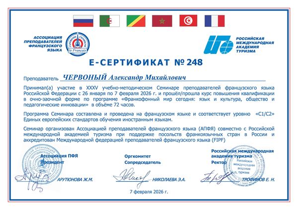 Новости все 16 февраля, 2026 Участие преподавателей кафедры немецкого и французского языков в 35 семинаре Ассоциации преподавателей французского языка России «Франкофонный мир сегодня: язык и общество, культура и педагогические инновации»С 26–29 января 20266 года в Москве прошел XXXV Всероссийский Семинар преподавателей французского языка. География семинара невероятно широка. В этом году это масштабное мероприятие объединило около 300 преподавателей высших и средних учебных заведений из многих городов России: Москвы, Санкт-Петербурга, Волгограда, Нижнего Тагила, Тулы, Уфы, Южно-Сахалинска, Ярославля и др. Традиционно в работе этого важнейшего для российской франкофонии форума приняли участие заведующий кафедрой О.В. Кравченко и профессор А.М. Червоный. Четыре дня насыщенной и плодотворной работы прошли под руководством 35 высококвалифицированных экспертов по преподаванию французского языка как иностранного из России, Франции, Алжира, Бенина, Мавритании и Марокко. Ежедневно проводились лекции и мастер-классы (в общей сложности 50 занятий). Семинар — это знаковое ежегодное мероприятие, которое дает отличный импульс к продуктивной профессиональной деятельности, мотивирует преподавателей и придает уверенность в перспективности французского языка и франкофонной культуры в нашей стране. Положительные отклики после проведения семинара как со стороны экспертов, так и от преподавателей позволяют надеяться на развитие и укрепление долгосрочных плодотворных связей между различными российскими и зарубежными учебными заведениями. |