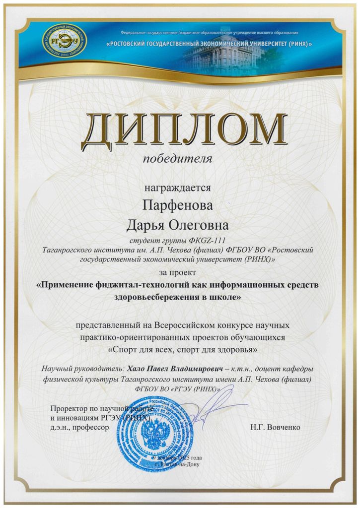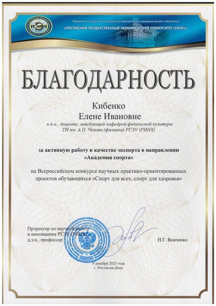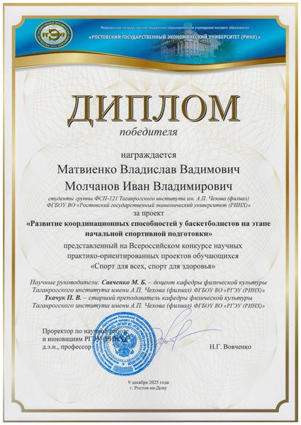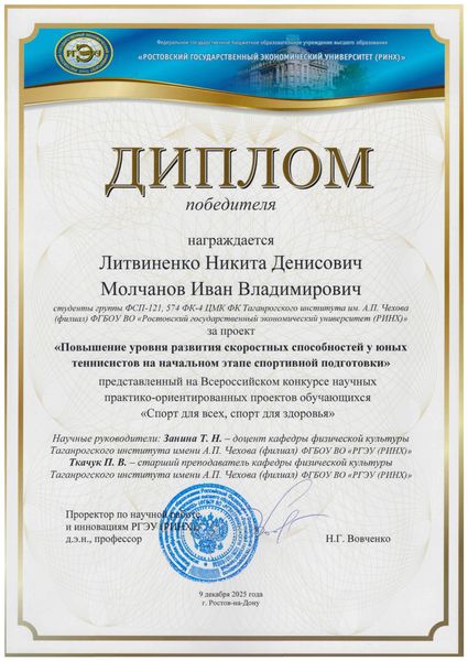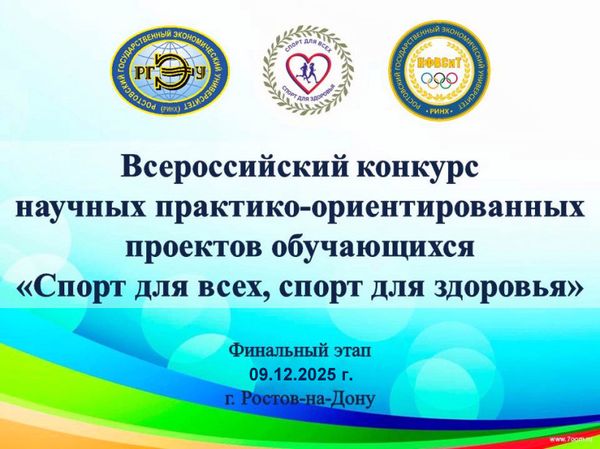 Новости все 16 марта, 2026 Студенты факультета физики, математики, информатики добились высоких результатов, приняв участие во Всероссийском конкурсе научных практико-ориентированных проектов обучающихся «Спорт для всех, спорт для здоровья», проводимом РГЭУ (РИНХ)Стали известны результаты финального этапа Всероссийского конкурса научных практико-ориентированных проектов обучающихся «Спорт для всех, спорт для здоровья», который проходил в смешанном формате 9 декабря 2025 года. Цель мероприятия, организованного кафедрой физического воспитания, спорта и туризма факультета компьютерных технологий и информационной безопасности РГЭУ (РИНХ), – выявление, отбор и информационная поддержка лучших научных практико-ориентированных проектов в области массового спорта на всех стадиях их осуществления, определение потенциала проектных технологий в сфере физической культуры и спорта. Конкурс проводился по шести направлениям: «Спорт IT», «Экономика спорта», «Академия спорта», «Спорт-медиа», «Спорт без границ», «Спорт и право». На конкурс было подано 220 работ, выполненных под научным руководством преподавателей из ведущих вузов России. Все проекты на отборочном этапе прошли экспертную оценку. Экспертной комиссией к участию в финальном этапе было допущено 15 научно-исследовательских работ. Студентами Таганрогского института имени А. П. Чехова (филиала) РГЭУ (РИНХ), обучающимися по профилям «Физическая культура» и «Дополнительное образование (спортивная подготовка)», было представлено три проекта. Проекты наших студентов и работа научных руководителей по подготовке докладов были особо отмечены экспертами конкурса. В итоге все проекты наших обучающихся одержали уверенную ПОБЕДУ в своих номинациях! Победителями конкурса стали: · Молчанов Иван Владимирович(ФФМИ, ФСП-121),Литвиненко Никита Денисович(574 ФК-4 ЦМК ФК, студент Политехнического института (филиала) ДГТУ в г. Таганроге (СПО)). o Научные руководители:Занина Татьяна Николаевна, доцент кафедры физической культуры, и Ткачук Полина Васильевна, старший преподаватель кафедры физической культуры. · Матвиенко Владислав Вадимович(ФФМИ, ФСП-121),Молчанов Иван Владимирович(ФФМИ, ФСП-121). Тема проекта: «Повышение уровня развития скоростных способностей у юных теннисистов на начальном этапе спортивной подготовки». o Научные руководители:Савченко Маргарита Борисовна, кандидат педагогических наук, доцент кафедры физической культуры, и Ткачук Полина Васильевна, старший преподаватель кафедры физической культуры. · Парфенова Дарья Олеговна(ФФМИ, ФКGZ-111). Тема проекта: «Применение фиджитал-технологий как информационных средств здоровьесбережения в школе». o Научный руководитель:Хало Павел Владимирович, кандидат технических наук, доцент кафедры физической культуры. Благодарственным письмом также была отмечена работа эксперта в направлении «Академия спорта» Всероссийского конкурса «Спорт для всех, спорт для здоровья» – кандидата педагогических наук, доцента, заведующей кафедрой физической культуры Елены Ивановны Кибенко. Кафедра физической культуры благодарит научных руководителей наших участников – Занину Татьяну Николаевну, Хало Павла Владимировича, Савченко Маргариту Борисовну, Ткачук Полину Васильевну – за проделанную работу, которая принесла три победы в копилку нашей студенчес