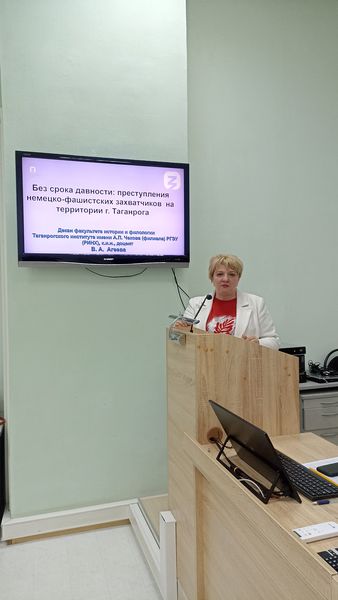 Новости все 21 апреля, 2026 Лекция «Без срока давности: преступления немецко-фашистских оккупантов и их пособников на территории г. Таганрога в 1941-1943 годах»В преддверии Дня памяти жертв геноцида советского народа, совершённого нацистами и их пособниками в годы Великой Отечественной войны, декан факультета истории и филологии Таганрогского института имени А. П. Чехова (филиала) РГЭУ (РИНХ), кандидат исторических наук, доцент В.А. Агеева выступила в качестве лектора Российского общества «Знание» и прочитала лекцию на площадке Главного управления Федеральной службы судебных приставов по Ростовской области. Лектор представила тему «Без срока давности: преступления немецко-фашистских оккупантов и их пособников на территории г. Таганрога в 1941–1943 гг.». В её содержание нашли отражение правовые и исторические аспекты федерального проекта «Без срока давности». В ходе лекции также был рассмотрен Указ Президиума Верховного Совета СССР № 39 от 19 апреля 1943 года «О мерах наказания для немецко-фашистских злодеев, виновных в убийствах и истязаниях советского гражданского населения и пленных красноармейцев, для шпионов, изменников родины из числа советских граждан и для их пособников». Так правительство впервые официально заявило, что идёт не просто война, а война на уничтожение советского народа. И в завершение изложения материала темы лектор обозначила факты: уничтожения больных из отделения для душевнобольных 5-й городской больницы, расстрелов мирных жителей и военнопленных на территории г. Таганрога и в Петрушинской «Балке смерти», преступления против детства, угон на принудительные работы в Третий рейх. |
