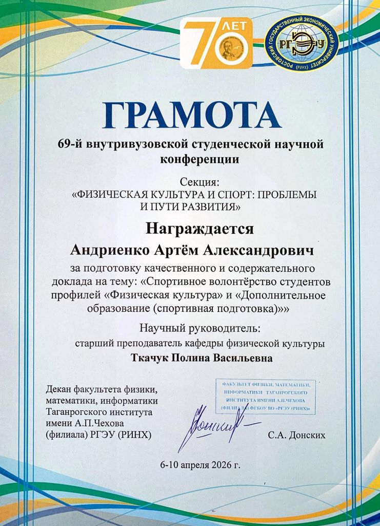 Новости все 22 апреля, 2026 Подведены итоги 69-й научно-практической студенческой конференции на кафедре физической культуры9 апреля на факультете физики, математики, информатики Таганрогского института имени А. П. Чехова (филиала) РГЭУ (РИНХ) состоялась 69-я научно-практическая студенческая конференция. Кафедра физической культуры являлась организатором одной из секций конференции – «Физическая культура и спорт: проблемы и пути развития». На секции было заслушано двадцать докладов. Тематика докладов была разнообразна и весьма актуальна. Студенты заострили внимание на проблеме формирования мотивации к двигательной активности школьников на уроках физической культуры, обсудили вопросы спортивно-массовой работы в школах и в высших учебных заведениях, затронули тему волонтёрской деятельности в вузе и многие другие. Итоги: Дипломом I степени награждена Борбега Виктория Александровна (ФФМИ, группа ФСП-111), тема доклада: «Студенческое волонтёрство как форма проявления социальной активности среди молодёжи». Научный руководитель – доцент кафедры физической культуры Лебединская Ирина Герардовна. Дипломом II степени награждён Шаихов Александр Дмитриевич (ФФМИ, группа ФСП-121), тема доклада: «Киберспорт и социализация». Научный руководитель – кандидат технических наук, доцент кафедры физической культуры Хало Павел Владимирович. Дипломом III степени награждена Кобрина Анна Александровна (ФФМИ, группа ФСП-151), тема доклада: «Применение VR-технологий в тактической подготовке тхэквондистов». Научный руководитель – кандидат технических наук, доцент кафедры физической культуры Хало Павел Владимирович. Также грамотами и благодарственными письмами от факультета физики, математики, информатики Таганрогского института имени А. П. Чехова (филиала) РГЭУ (РИНХ) за подготовку качественного и содержательного доклада были награждены: · Молчанов Иван Владимирович(ФФМИ, группа ФСП-121) иВасиленко Кирилл Алексеевич(ФФМИ, группа ФСП-121), тема доклада: «Сказки – проектная деятельность». Научный руководитель – доцент кафедры физической культуры Занина Татьяна Николаевна. · Афанасьев Михаил Владимирович(ФФМИ, группа ФСП-131), тема доклада: «От ГТО к ТехноГТО: эволюция физической культуры в цифровую эпоху». Научный руководитель — доцент кафедры физической культуры Сыроваткина Ирина Анатольевна. · Андреенко Артём Александрович(ФФМИ, группа ФСП-131), тема доклада: «Спортивное волонтёрство студентов профилей "Физическая культура" и "Дополнительное образование (спортивная подготовка)"». Научный руководитель – старший преподаватель кафедры физической культуры Ткачук Полина Васильевна. · Тригубко Алина Артёмовна(студентка группы 573 ФК-4 Политехнического института (филиала) ДГТУ в г. Таганроге), тема доклада: «Отношение обучающихся к урокам физической культуры и своему здоровью». Научный руководитель – преподаватель Политехнического института (филиала) ДГТУ в г. Таганроге Занина Татьяна Николаевна. · Абрамова Арианна Петровна(студентка группы 604 ФК-2 Политехнического института (филиала) ДГТУ в г. Таганроге), тема доклада: «Особенности образного обучения в технической подготовке единоборцев». Научный руководитель – преподаватель Политехнического института (филиала) ДГТУ в г. Таганроге Занина Татьяна Николаевна. В торжественной обстановке также были в