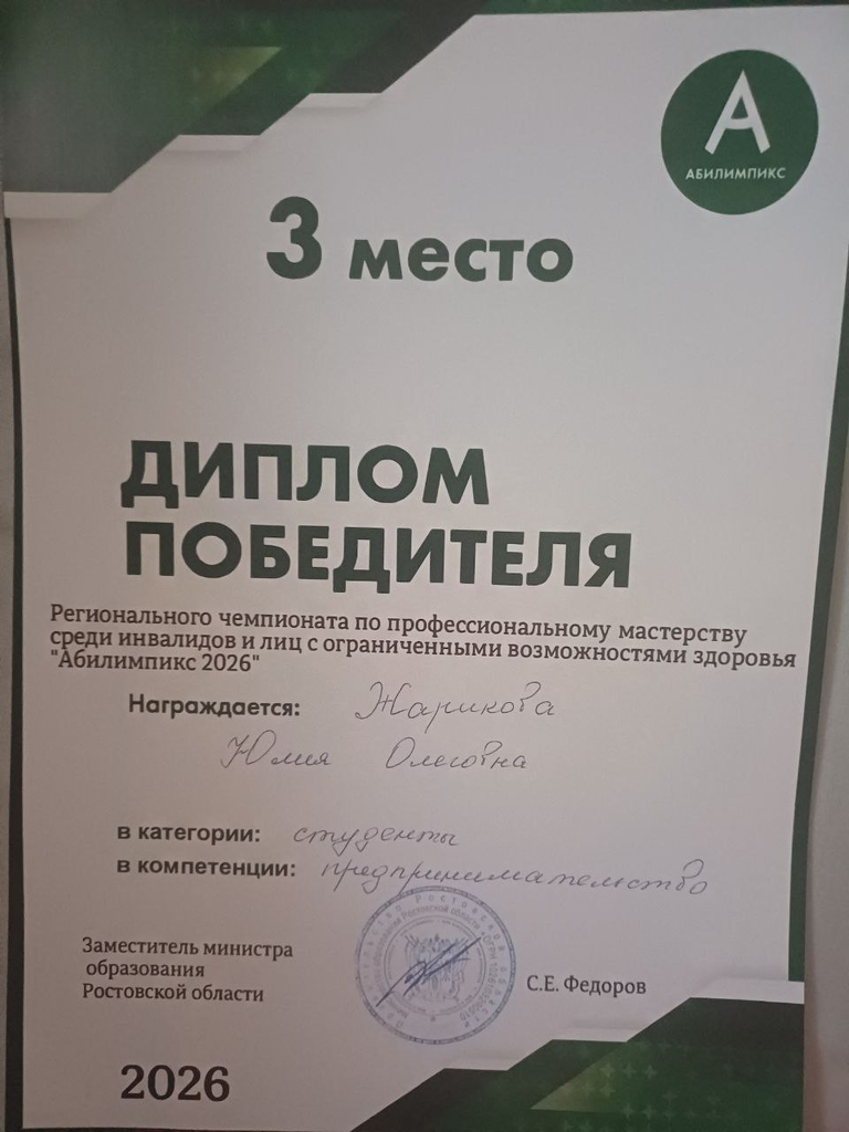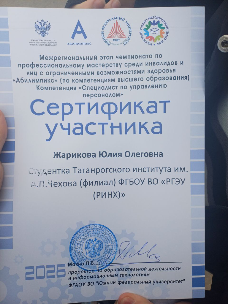 Новости все 26 марта, 2026 Студентка факультета экономики и права – призер регионального чемпионата «Абилимпикс» – 202617 марта на площадке ГБПОУ РО «Ростовский-на-Дону колледж радиоэлектроники, информационных и промышленных технологий» состоялся конкурс по компетенции «Предпринимательство (студенты)», проходивший в рамках XI регионального чемпионата по профессиональному мастерству среди инвалидов и лиц с ограниченными возможностями здоровья «Абилимпикс» президентской платформы «Россия – страна возможностей» и Министерства просвещения России для участников из Ростовской области. Представителем нашего института выступила Жарикова Юлия, студентка первого курса факультета экономики и права, обучающаяся по направлению «Профессиональное обучение (по отраслям)» (профиль «Экономика и управление организацией»), под руководством кандидата экономических наук, доцента кафедры экономики и гуманитарно-правовых дисциплин Екатерины Александровны Лысенко. По результатам работы над конкурсным заданием, включавшим четыре модуля, каждый из которых требовал продумать бизнес-модель своего предприятия, выступить в роли учредителя коммерческого предприятия, самостоятельно выбирая сферу и методы ведения предпринимательской деятельности, презентовать свой проект и ответить на вопросы экспертов, Юлия заняла третье призовое место. А также 19 марта на площадке ФГАОУ ВО «ЮФУ» в Точке кипения Жарикова Юлия приняла участие в конкурсе, получив сертификат участника по компетенции «Специалист по управлению персоналом (студенты)». Поздравляем Юлию и наставника Е.А. Лысенко с достойным результатом! |