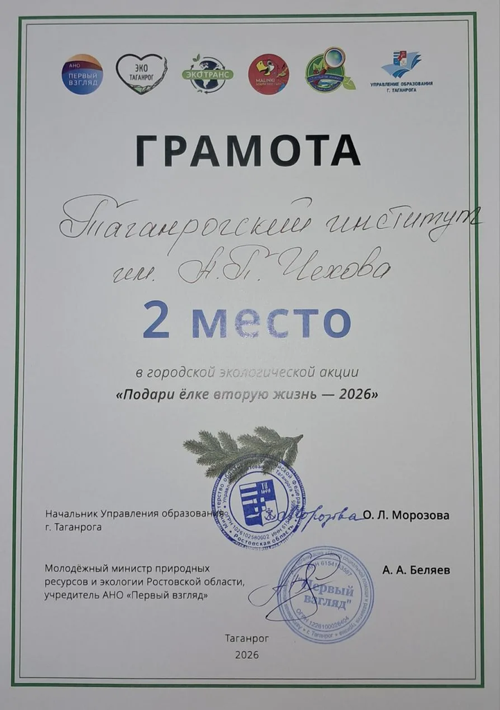 Новости все 12 февраля, 2026 Экологическая акция «Подарите елке вторую жизнь»10 февраля 2026 года на площадке МБУК «Центральная городская публичная библиотека имени А. П. Чехова» города Таганрога состоялось торжественное награждение победителей конкурса городской экологической акции «Подарите елке вторую жизнь», организованного региональным оператором ООО "ЭКОТРАНС" и общественным движением «ЭкоТаганрог» при поддержке благотворительного фонда «Синара». Экологическая акция «Подарите елке вторую жизнь» направлена на облегчение процесса утилизации хвойных деревьев, которые украшали дома таганрожцев в течение новогодних праздников. Одним из способов правильной утилизации деревьев считается вторичная переработка. Собранные деревья отправляются на специальные заводы, где их измельчают в щепу. Щепа используется для производства строительных материалов, мебели, бумаги и других товаров. Также елки используются в качестве корма для животных. В 2026 году организаторы акции объявили конкурс, в рамках которого необходимо было сдать ёлку на пункт сбора, сделать фото с ёлочкой около точки сбора и отправить куратору. Конкурс проводился при поддержке Фонда президентских грантов. Конкурс проходил в течение трех недель. Его участниками могли стать как индивидуальные горожане, так и коллективы предприятий и учреждений. Для удобства была организована система специальных площадок, куда жители могли сдать свои новогодние деревья. Таганрогский институт имени А.П. Чехова по результатам конкурса занял почетное второе место. Церемонию награждения провел молодежный министр природных ресурсов и экологии Ростовской области, учредитель АНО «Первый взгляд» Алексей Александрович Беляев. Таганрогский институт имени А.П. Чехова на церемонии награждения представили начальник отдела воспитательной и профориентационной работы, организационного сопровождения деятельности и развития карьеры О.А. Липовая и студенты института. В акции «Елки – в переработку» приняли участие обучающиеся, преподаватели, сотрудники института, а также жители города Таганрога. Волонтерами института было собрано более 50 елей и сосен. Собранные деревья будут отправлены в южный парк птиц "Малинки" для его обитателей. Проведение экологических акций привлекает внимание к программе раздельного сбора бытовых отходов, способствует повышению экологической грамотности населения. Помимо этого, акция помогла предотвратить навалы сезонных крупногабаритных отходов на придомовых контейнерных площадках и увеличить объемы вторичного сырья. Выражаем благодарность участникам экологической акции! Желаем новых свершений, побед, творческих успехов! Берегите природу! |