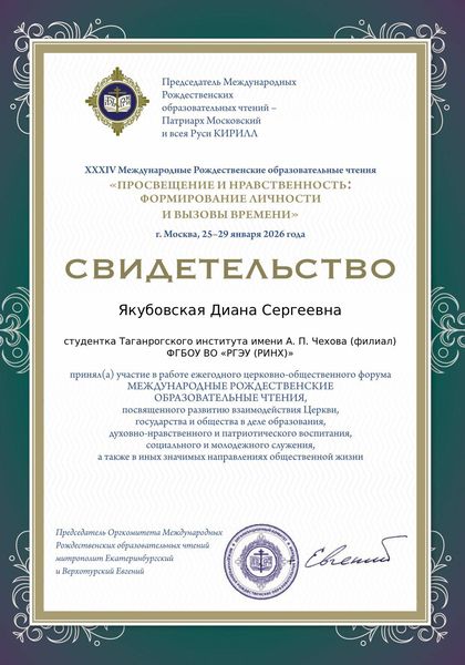 Новости все 13 февраля, 2026 Участие студентки факультета истории и филологии в XXXIV Международных рождественских чтениях «Просвещение и нравственность: формирование личности и вызовы времени»Студентка второго курса (профили «История» и «Обществознание») Диана Якубовская приняла участие в поездке в Москву в составе делегации Неклиновского района под руководством начальника Управления образования, канд. пед. наук В. М. Пегушина. Программа поездки была насыщенной. Ключевым событием стало участие в XXXIV Международных Рождественских образовательных чтениях «Просвещение и нравственность: формирование личности и вызовы времени». Также в программу вошли: посещение Государственной Думы и встреча с депутатом С. В. Бурлаковым, концерт в Кремлёвском дворце, экскурсии в Храм Христа Спасителя и Музей Федеральной службы безопасности. Кроме того, участники делегации познакомились с историко-культурными достопримечательностями столицы: Измайловским Кремлём, архитектурным ансамблем Соборной площади Кремля, Оружейной палатой и Картинной галереей им. И. С. Глазунова. Поездка подарила студентке бесценный практико-ориентированный опыт. |