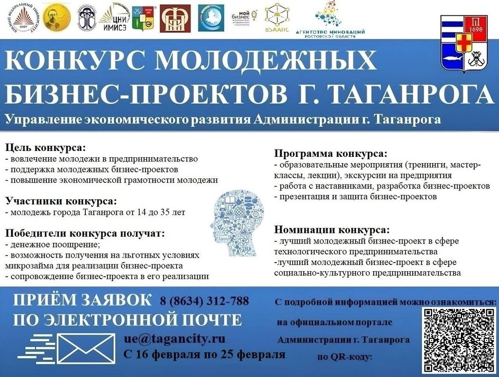 Новости все 13 февраля, 2026 Конкурс молодежных бизнес-проектов города Таганрога 2026 г.Управлением экономического развития Администрации города Таганрога объявляется 4-й городской Конкурс молодежных бизнес-проктов города Таганрога. Конкурс проводится при поддержке и участии Института управления в экономических, экологических и социальных системах ЮФУ, Центра научных исследований «Инструментальные, математические и интеллектуальные средства в экономике» «Южного федерального университета», Таганрогского института В этом году в качестве партнера к Конкурсу присоединилось АНО «Агентство инноваций Ростовской области», представители которого проведут ряд образовательных мероприятий для конкурсантов. К участию в конкурсе приглашаются молодые люди в возрасте от 14 до 35 лет, заинтересованные в открытии собственного дела или продвижении уже действующего бизнеса. Дополнительную информацию можно получить по телефону: +7 (928) 760-57-07 – декан факультета экономики и права Стеценко Ирина Александровна; +7 (918) 561-33-08 – заведующий кафедрой экономики и гуманитарно-правовых дисциплин Сердюкова Юлия Александровна. |
