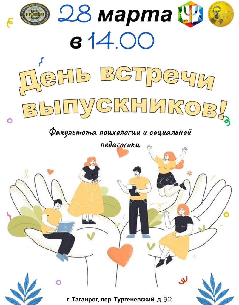 Новости все 17 марта, 2026 Внимание!28 марта 2026 г. в 14.00 состоится День встречи выпускников факультета психологии и социальной педагогики ТИ имени А.П. Чехова (филиала) РГЭУ (РИНХ)! Именно здесь зародились самые яркие воспоминания, крепкая студенческая дружба и первая любовь... Теперь пришло время вновь окунуться в атмосферу юности! Ждём вас! Место проведения: г. Таганрог пер. Тургеневский, д .32 (1 этаж) |