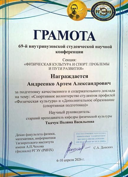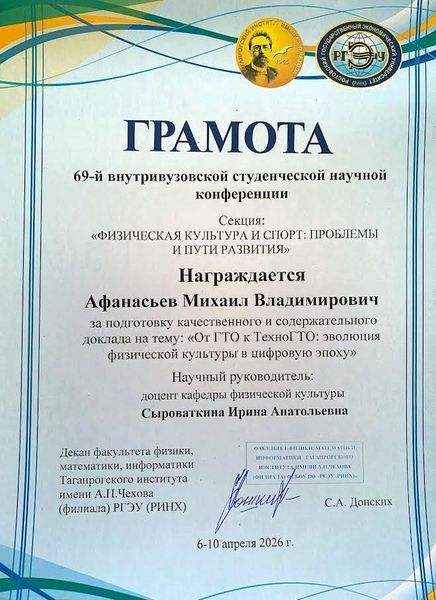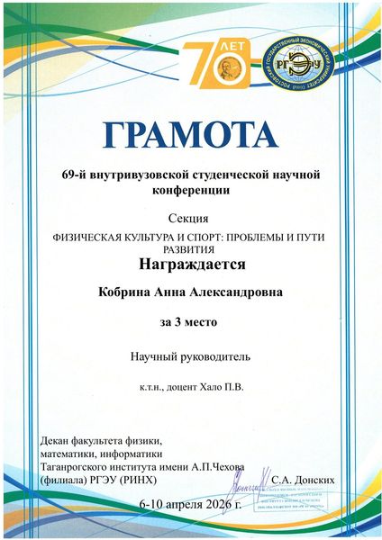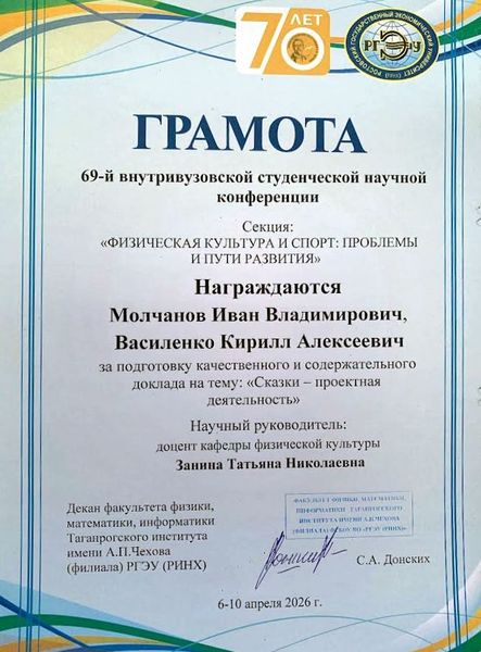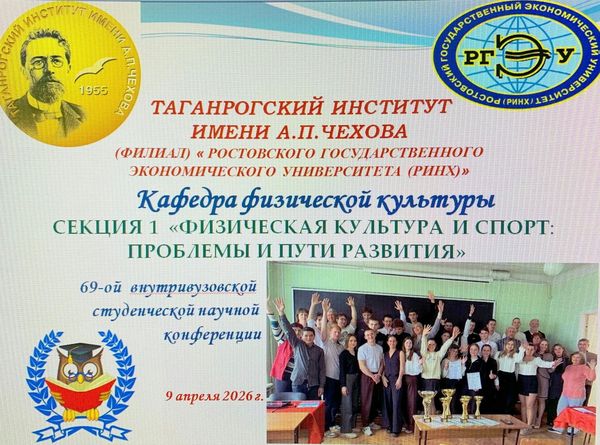 Новости все 22 апреля, 2026 Подведены итоги 69-й научно-практической студенческой конференции на кафедре физической культуры9 апреля на факультете физики, математики, информатики Таганрогского института имени А. П. Чехова (филиала) РГЭУ (РИНХ) состоялась 69-я научно-практическая студенческая конференция. Кафедра физической культуры являлась организатором одной из секций конференции – «Физическая культура и спорт: проблемы и пути развития». На секции было заслушано двадцать докладов. Тематика докладов была разнообразна и весьма актуальна. Студенты заострили внимание на проблеме формирования мотивации к двигательной активности школьников на уроках физической культуры, обсудили вопросы спортивно-массовой работы в школах и в высших учебных заведениях, затронули тему волонтёрской деятельности в вузе и многие другие. Итоги: Дипломом I степенинаграждена Борбега Виктория Александровна (ФФМИ, группа ФСП-111), тема доклада: «Студенческое волонтёрство как форма проявления социальной активности среди молодёжи». Научный руководитель – доцент кафедры физической культуры Лебединская Ирина Герардовна. Дипломом II степенинаграждён Шаихов Александр Дмитриевич (ФФМИ, группа ФСП-121), тема доклада: «Киберспорт и социализация». Научный руководитель – кандидат технических наук, доцент кафедры физической культуры Хало Павел Владимирович. Дипломом III степенинаграждена Кобрина Анна Александровна (ФФМИ, группа ФСП-151), тема доклада: «Применение VR-технологий в тактической подготовке тхэквондистов». Научный руководитель – кандидат технических наук, доцент кафедры физической культуры Хало Павел Владимирович. Также грамотами и благодарственными письмами от факультета физики, математики, информатики Таганрогского института имени А. П. Чехова (филиала) РГЭУ (РИНХ) за подготовку качественного и содержательного доклада были награждены: · Молчанов Иван Владимирович(ФФМИ, группа ФСП-121) иВасиленко Кирилл Алексеевич(ФФМИ, группа ФСП-121), тема доклада: «Сказки – проектная деятельность». Научный руководитель – доцент кафедры физической культуры Занина Татьяна Николаевна. · Афанасьев Михаил Владимирович(ФФМИ, группа ФСП-131), тема доклада: «От ГТО к ТехноГТО: эволюция физической культуры в цифровую эпоху». Научный руководитель — доцент кафедры физической культуры Сыроваткина Ирина Анатольевна. · Андреенко Артём Александрович(ФФМИ, группа ФСП-131), тема доклада: «Спортивное волонтёрство студентов профилей "Физическая культура" и "Дополнительное образование (спортивная подготовка)"». Научный руководитель – старший преподаватель кафедры физической культуры Ткачук Полина Васильевна. · Тригубко Алина Артёмовна(студентка группы 573 ФК-4 Политехнического института (филиала) ДГТУ в г. Таганроге), тема доклада: «Отношение обучающихся к урокам физической культуры и своему здоровью». Научный руководитель – преподаватель Политехнического института (филиала) ДГТУ в г. Таганроге Занина Татьяна Николаевна. · Абрамова Арианна Петровна(студентка группы 604 ФК-2 Политехнического института (филиала) ДГТУ в г. Таганроге), тема доклада: «Особенности образного обучения в технической подготовке единоборцев». Научный руководитель – преподаватель Политехнического института (филиала) ДГТУ в г. Таганроге Занина Татьяна Николаевна. В торжественной обстановке также были вру