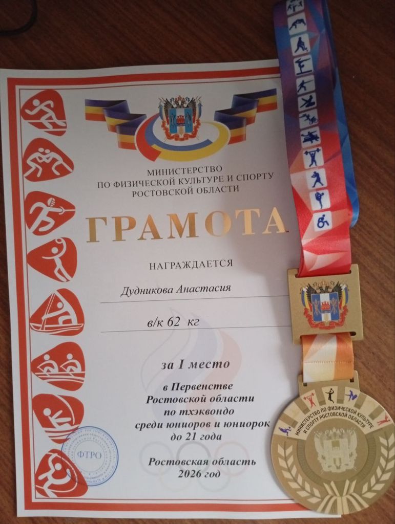Новости все 25 февраля, 2026 Победа в Первенстве Ростовской области по тхэквондоДудникова Анастасия, студентка группы НДО-421, одержала уверенную победу в Первенстве Ростовской области по тхэквондо среди юниоров и юниорок до 21 года и, тем самым, завоевала право представлять нашу область на Чемпионате России по данному виду спорта. |