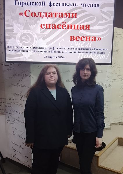 Новости все 27 апреля, 2026 Студенты ТИ имени А.П. Чехова выступили на городском фестивале выразительного чтения «Солдатами спасённая весна»23 апреля состоялся ежегодный городской фестиваль выразительного чтения «Солдатами спасённая весна». Обучающиеся учреждений профессионального образования города выступили с произведениями о Великой Отечественной войне, а также о бойцах и героях СВО. На фестивале звучали стихи как поэтов военных и послевоенных лет, так и современных авторов. Наш институт был достойно представлен обучающимися СПО: Ириной Теремшонок (Муса Джалиль «Варварство») и Ширин Сузаной (Илья Эренбург «Русская земля»). Поздравляем девушек с успешным выступлением на фестивале и желаем им дальнейших творческих успехов! |